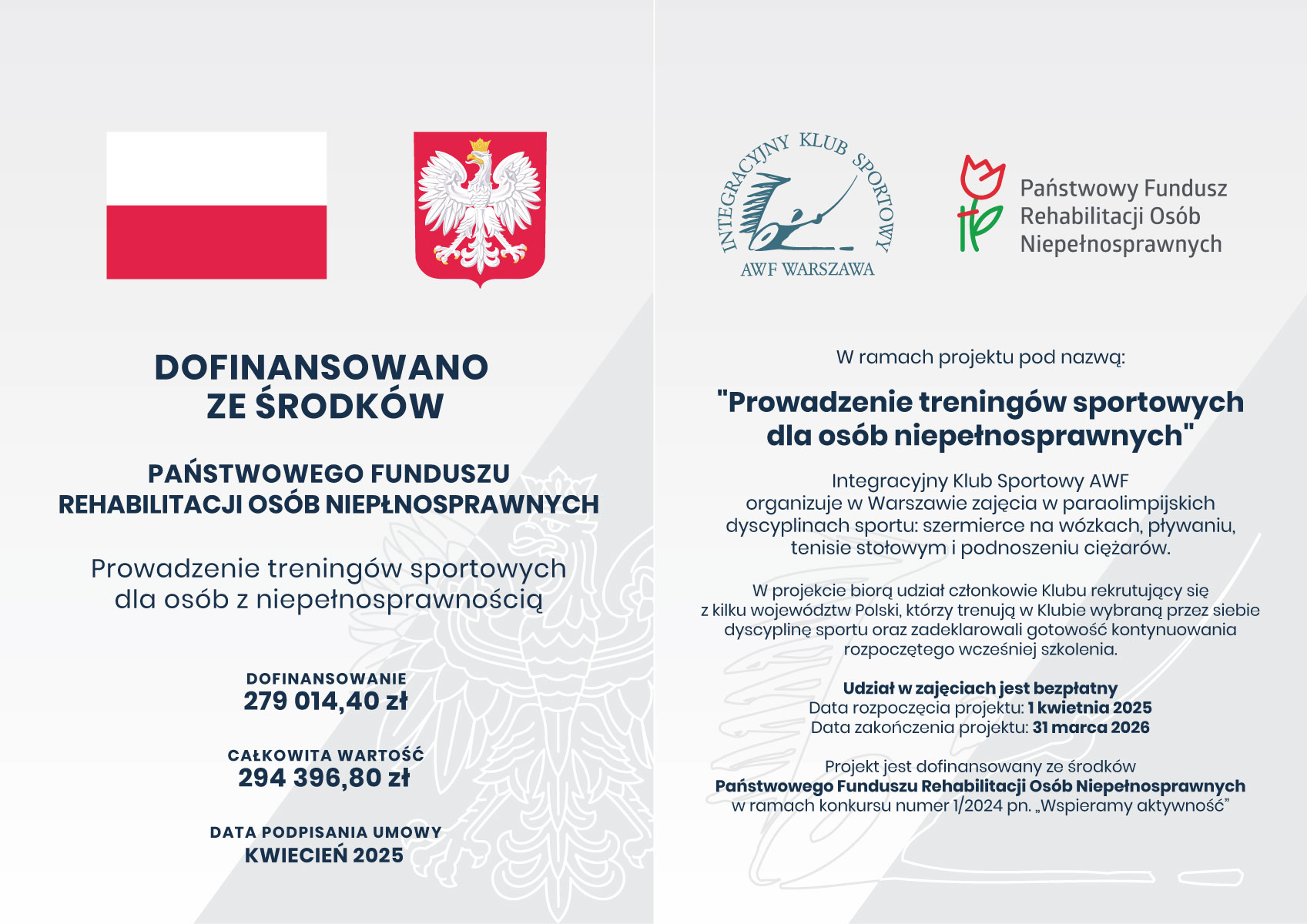 Dzięki wsparciu m.st. Warszawa Integracyjny Klub Sportowy AWF realizuje program z zakresu sportu osób z niepełnosprawnościami. Projekt jest zadaniem całorocznym, trwa od 2 stycznia do 31 gudnia 2025 roku i nosi nazwę "Szkolenie i współzawodnictwo sportowe osób niepełnosprawnych". Zadanie jest dofinansowane ze środków m.st. Warszawa.